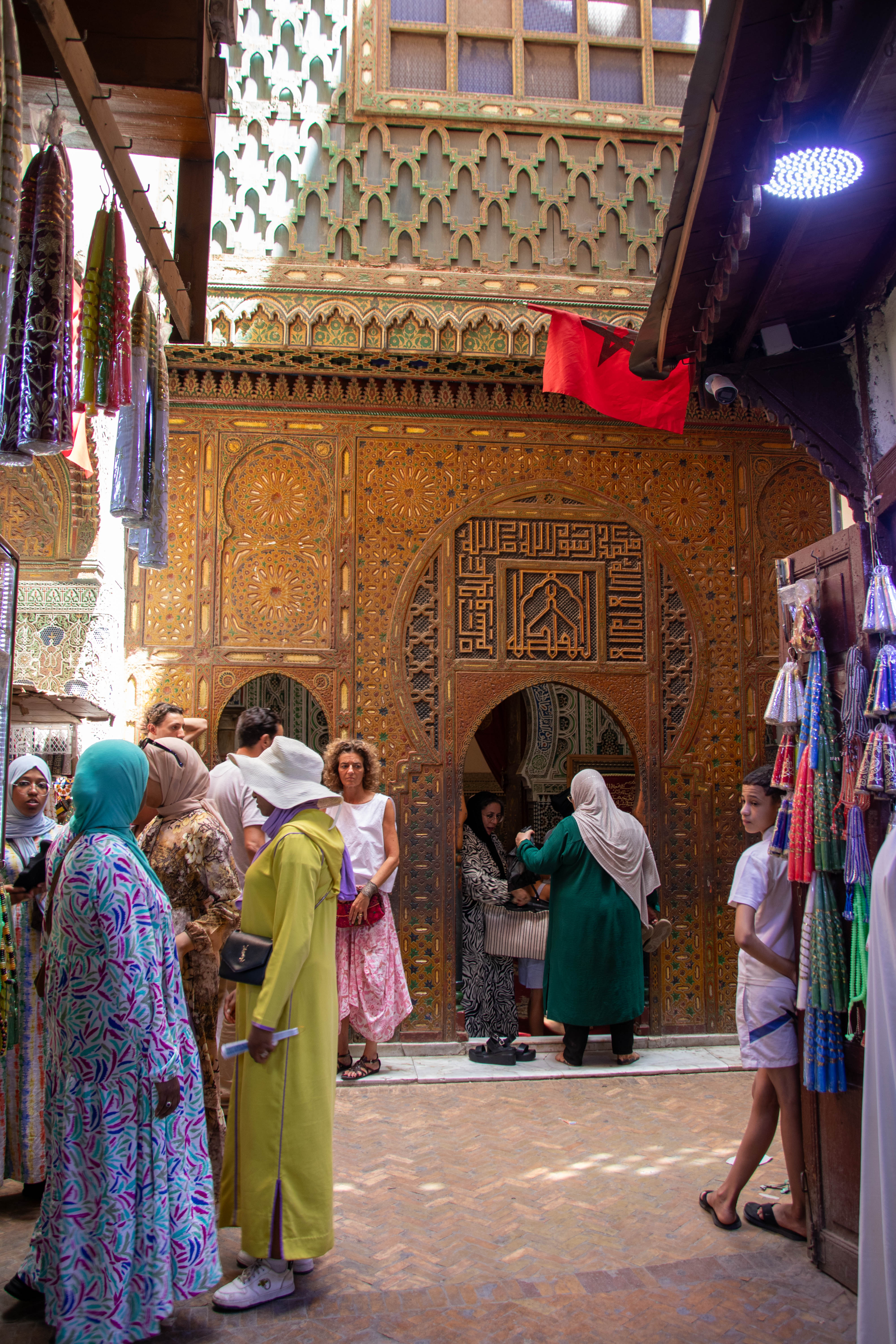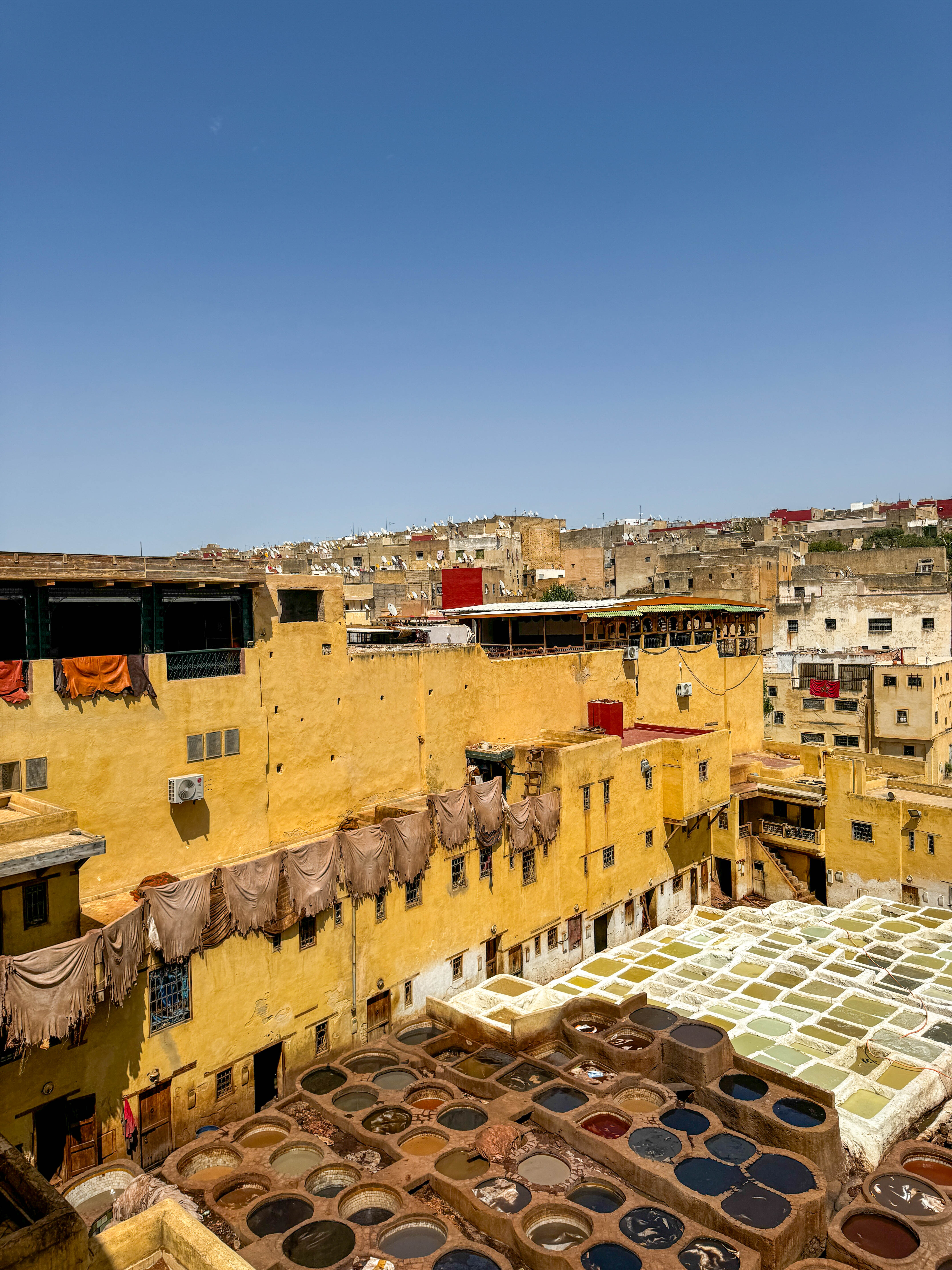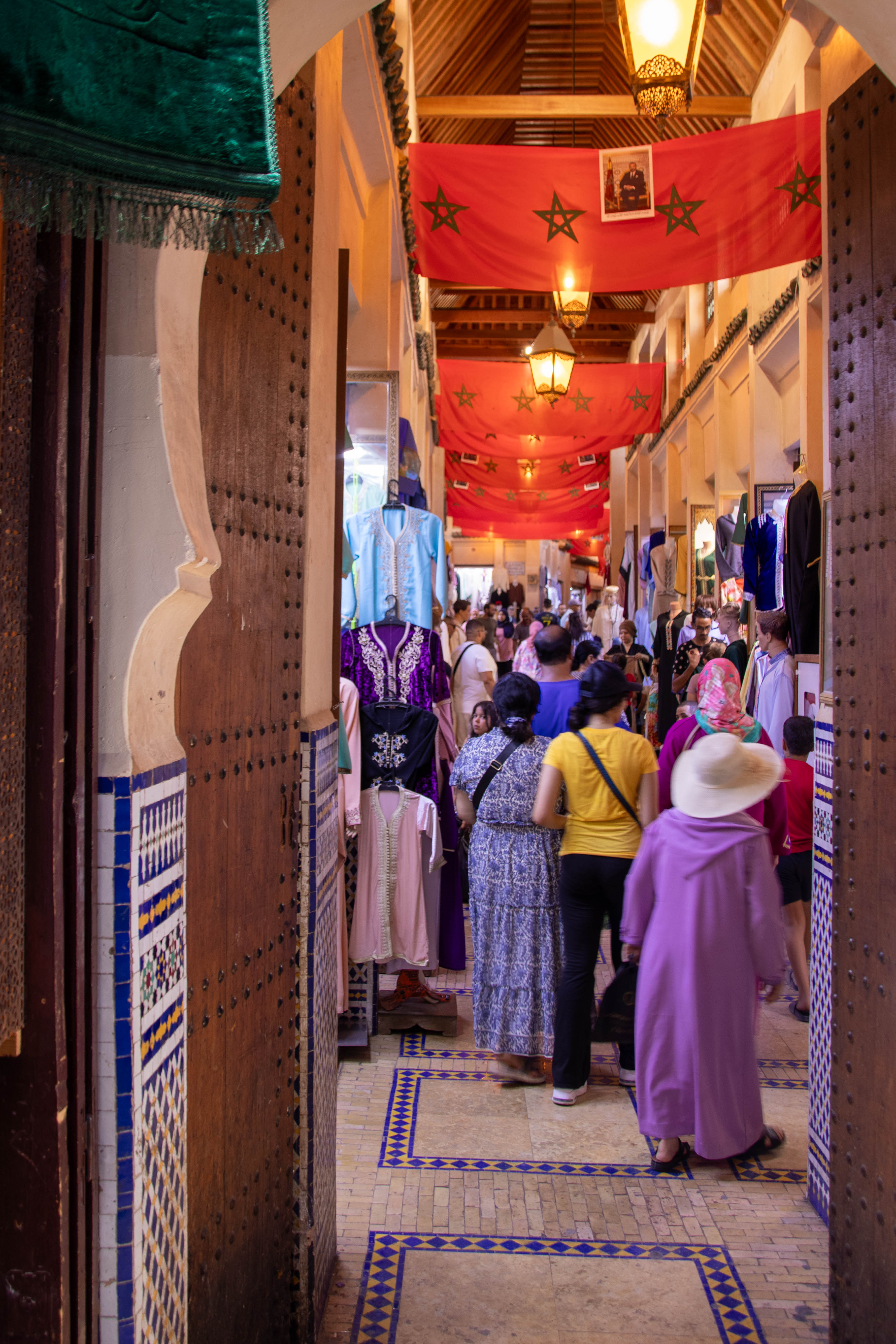 Om half 2 stond onze gids ons op te wachten voor een wandeling door de drukke en chaotische medina. De drukte was er enorm. Je weet eigenlijk niet waar eerst kijken terwijl je je langs kraampjes en mensen wringt, terwijl je karren, ezels en vooral veel mensen probeert te ontwijken We bezochten een paar interessante plaatsen, zoals een school, een weverij en de befaamde leerlooierij. Overal proberen ze je iets te verkopen, maar volgens onze gids moet je je niet verplicht voelen om iets te kopen. Winkels zoals de bekende nummer 10 van waar je de leerlooierij kan zien, zijn verplicht door de regering om hun zaak open te stellen voor toeristen.